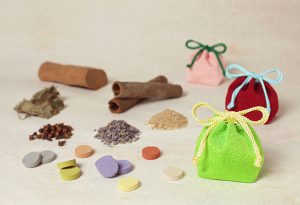 香老舗 松栄堂の手ほどきで香りのタブレットを組み合わせ、自分だけの香りを創作、お好みの巾着に入れてお持ち帰り