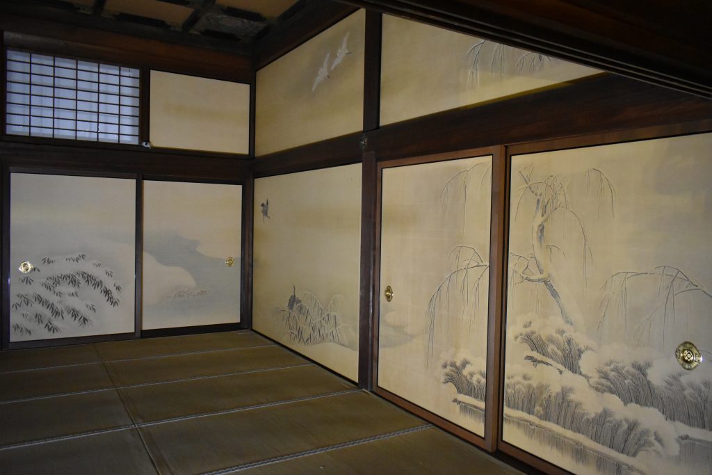 令和7年度の原画公開は、「シリーズ転調の花鳥」と題して、二の丸御殿の各棟の北東にあたる部屋に描かれた障壁画に焦点を当てて紹介しています。冬期は、水墨画で花鳥画が描かれた〈白書院〉四の間の《雪中梅竹柳小禽図》と帳台の間の《秋草図》を公開します。四の間の笹に休む雀は「眠り雀」の名で親しまれています。