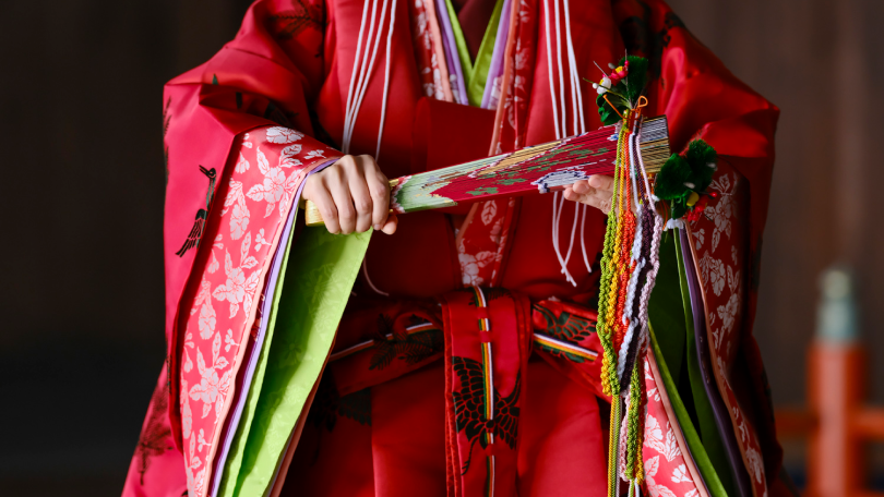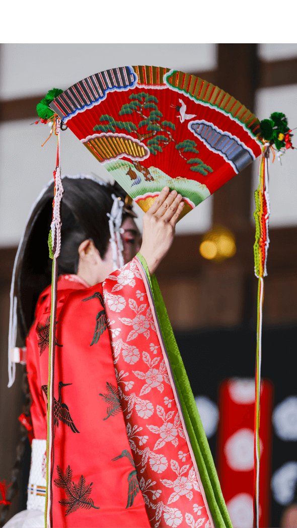 緋色地桜文様の表着などの上に、松に鶴の文様の唐衣をまとい、手に檜扇を持った舞姫が優雅に舞った大正期の五節舞。昭和以降、唐衣の文様は鳳凰に牡丹に、緋色の袿は萌黄色になりました。鮮やかな緋色が印象的な大正期の五節舞の衣装の再現を試みました。