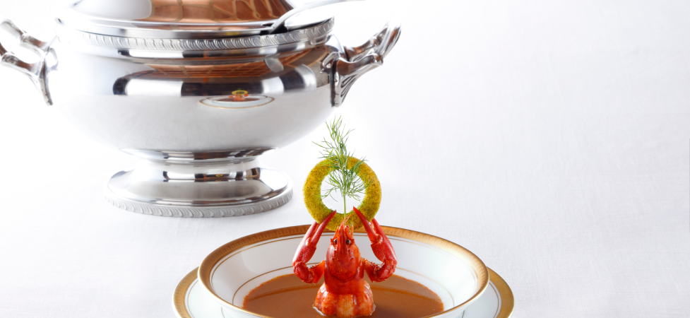料理を担当した宮内省大膳寮で主厨長だったのが「天皇の料理番」としてテレビドラマのモデルにもなった秋山徳蔵氏。フランスから帰国し、この大役を任されました。「蝲蛄濁羹(ザリガニのポタージュ)」など、史料に残されていたフランス料理の献立を現代解釈のもと料理を再現しました。