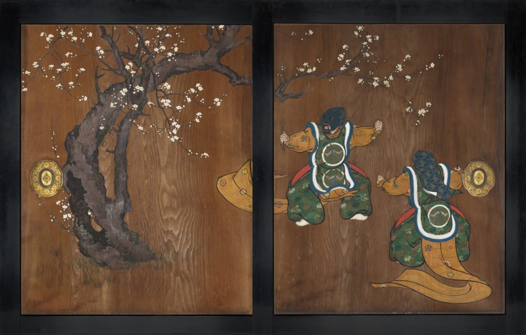 舞楽「納曾利」を舞う2人の人物と白梅が描かれます。